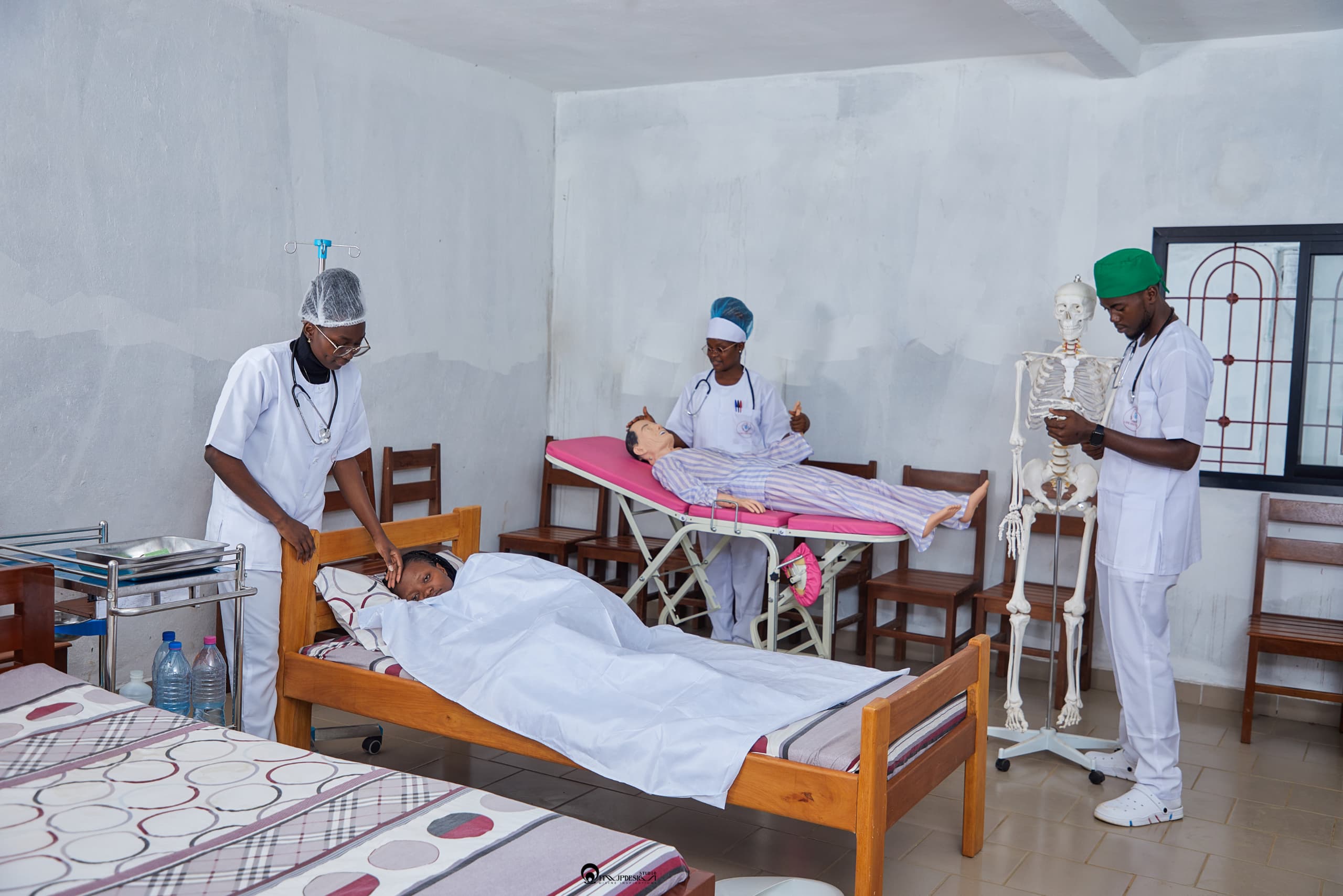 L’école dispose en son sein d’équipements de pointe pour une formation plus pratique et immersive des étudiants. On y retrouve entre autres:un laboratoire d’analyses médicales,une pharmacie,un laboratoire de kinésithérapie équipé des instruments pratiques et adaptés à la formation,une salle expérimentale d’hospitalisation et de soins infirmiers équipée de tous les spécimens caractéristiques du corps humain.une salle multimédia équipée des ordinateurs en réseau, afin d’arrimer les étudiants aux TIC, Un WIFI à haut débit sur l’ensemble du campus, nécessaire pour la recherche approfondie.Une bibliothèque d’une capacité de 5000 livres toutes disciplines confondues.Un espace de consultation en présentiel d’une capacité de 20 places.Des logements estudiantins pour faciliter l’hébergement des étudiants/apprenants en provenance des villes et pays voisinsUn restaurant universitaireUne navette de transport pour faciliter le transport des étudiants et du personnelUn complexe de sports multi-fonctionnelUne salle de fête de grande capacitéDes salles de classes spacieuses et modernesDes espaces verts pour la détente et la relaxation Nos infrastructures garantissent une formation de qualité s Des laboratoires Une bibliothèque Une infirmerie Une salle de kinésithérapie Une salle multimedia Une navette de transport Une salle d'hospitalisation Un Restaurant universitaire Des logements estudiantins