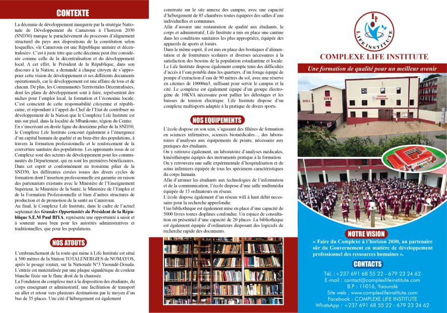Le complexe LIFE INSTITUTE de MBANKOMO YAOUNDE, ouvert depuis le 1er Octobre 2022, est entrain de s’apprêter à clôturer l’année académique 2022-2023 en beauté, avec une première cuvée de plus de 250 étudiants en 7 filières médico-sanitaires, un Cycle de licence professionnel en sciences infirmières et sciences biomédicales, un Cycle de Master en plusieurs filières des spécialités médico-sanitaires et un Cycle de licence en sciences juridiques. L’Institut vient de marquer un saut qualitatif avec la signature d’une convention de tutelle académique avec l’Université d’Ebolowa, qui devra délivrer les diplômes de Licences et Masters aux termes des cycles de formation. les images qui suivent sont une illustration de cette étape de la croissance de notre Institut qui entend offrir aux jeunes camerounais un cadre idéal de formation de qualité pour sauver les vies humaines. Nous vous invitons à en faire large diffusion pour le grand plaisir de ceux qui voudront bien nous faire confiance pour la formation professionnelle de leurs enfants. L’institut est ouvert de Lundi à samedi de 8h à 17h pour vous apporter toute information utile à vos options. Voire les contacts sur le dépliant ci-joint.